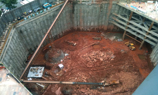 四川航空廣場(chǎng)超深基坑支護(hù)工程,基坑周長(zhǎng)約250米,地下6層,基坑深度28.5米(主樓核心筒達(dá)30米),是成都市有史以來最深基坑之一。設(shè)計(jì)采用排樁+預(yù)應(yīng)力錨索+內(nèi)支撐相結(jié)合的圍護(hù)體系, 護(hù)壁樁樁徑1.5米,樁距2.0米,樁長(zhǎng)34米,樁數(shù)131根;鋼構(gòu)立柱樁9根,樁長(zhǎng)33米;預(yù)應(yīng)力錨索6排;內(nèi)支撐3處、縱向4層;降水井13口;土、石方挖運(yùn)約13萬立方米。工程于2012年12月竣工驗(yàn)收。