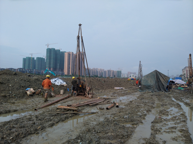 該項目巖土工程勘察原計劃工期為20個日歷天,勘探鉆孔782個、鉆探工作量17118米。開工初期,雖然調集了30臺鉆機進場,但要滿足建設單位的工期要求,仍存在很大差距,加之連續下雨導致場地積水嚴重且泥濘不堪,勘探進度十分緩慢,我院水文地質工程公司迅速組織安排專人聯系成都、重慶、成都周邊地區的數十支鉆探隊伍,鉆機增至50臺。