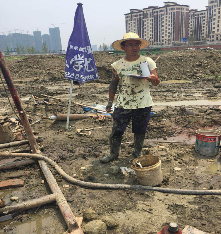 在泥濘場地中安排鉆探生產的項目負責人范偉 勘察項目現場實測溫度約46度