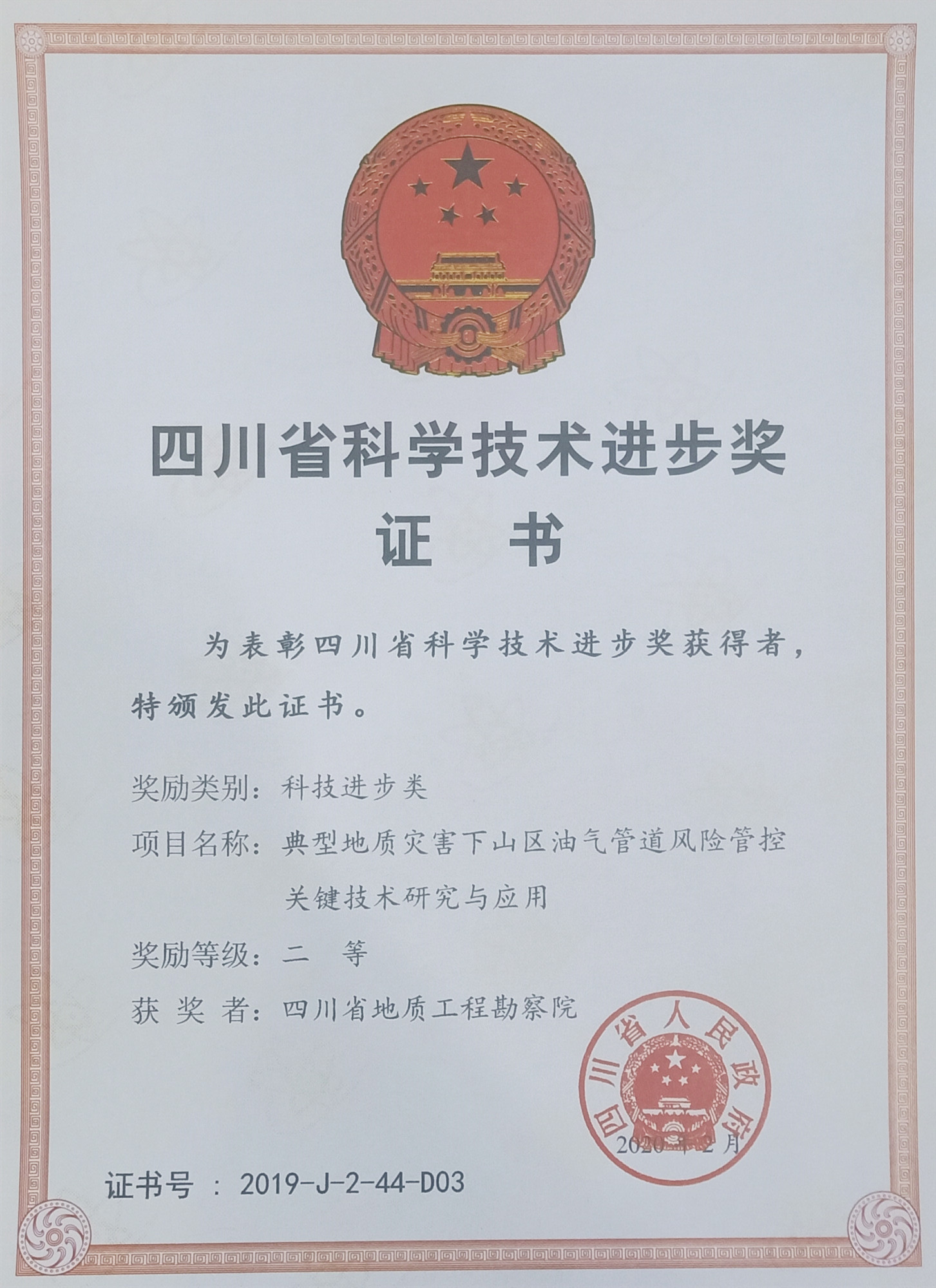 4月21日上午,四川省科學(xué)技術(shù)獎勵大會在成都舉行,大會公布了2019年度四川省科技進步獎獲獎名單。其中,四川省地質(zhì)工程勘察院集團有限公司《典型地質(zhì)災(zāi)害下山區(qū)油氣管道風(fēng)險管控關(guān)鍵技術(shù)研究與應(yīng)用》項目獲四川省科學(xué)技術(shù)進步獎二等獎。