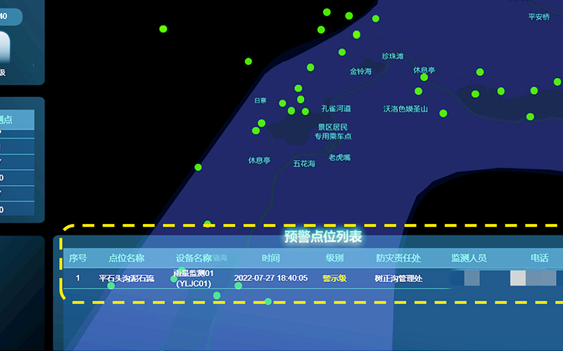 2022年7月27日18時40分許,川勘集團承建的九寨溝景區地質災害監測預警平臺顯示的平石頭溝泥石流“警示級”預警信息立刻引起了現場值班人員李強的警覺。監測數據顯示:該泥石流區域發生了短時強降雨,15分鐘降雨量為10.4mm,已達“警示級”,泥位監測01#數據變化值達0.28m,與平臺報警信息較一致。